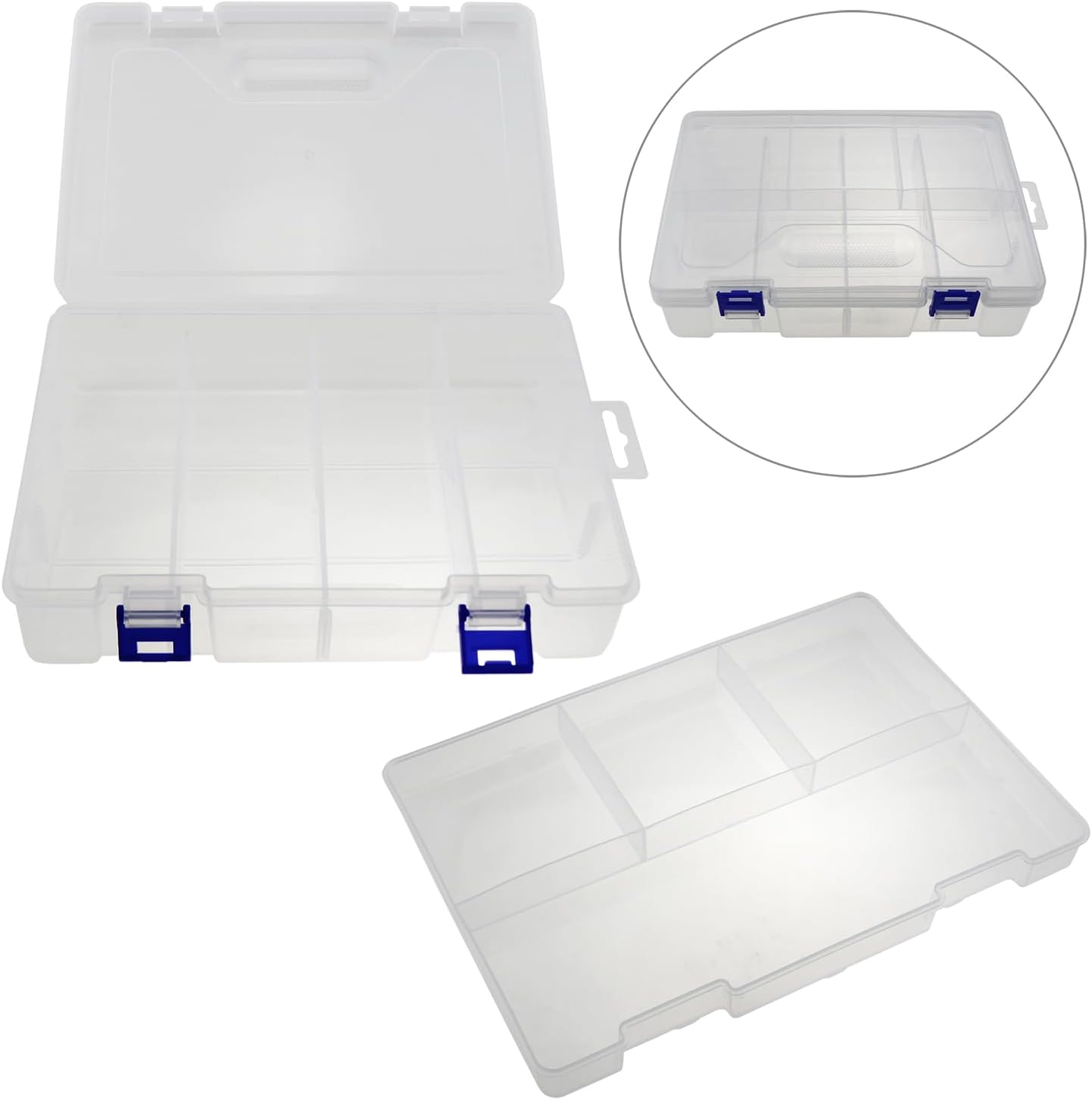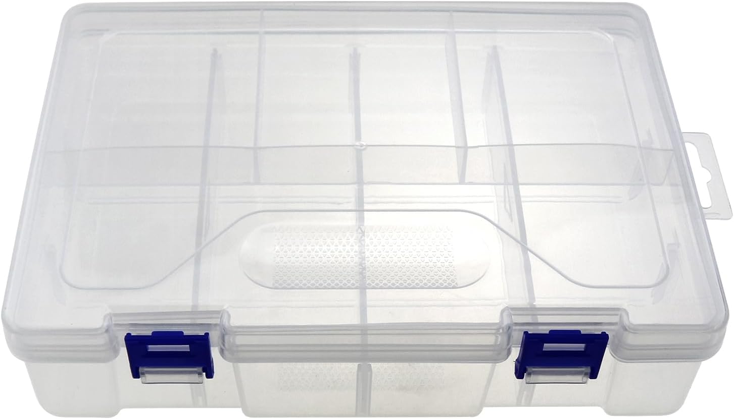 - Fishing storage box: Tackle case sturdy latch closes securely without getting mixed up or falling apart. Self contained non slip grooves for easy carrying, Removable top tray with 4 non removable compartments, Bottom storage unit with 3 removable and adjustable compartments that can be divided into 4 compartments, Designed with side hanging holes to hang on the wall and save your space.