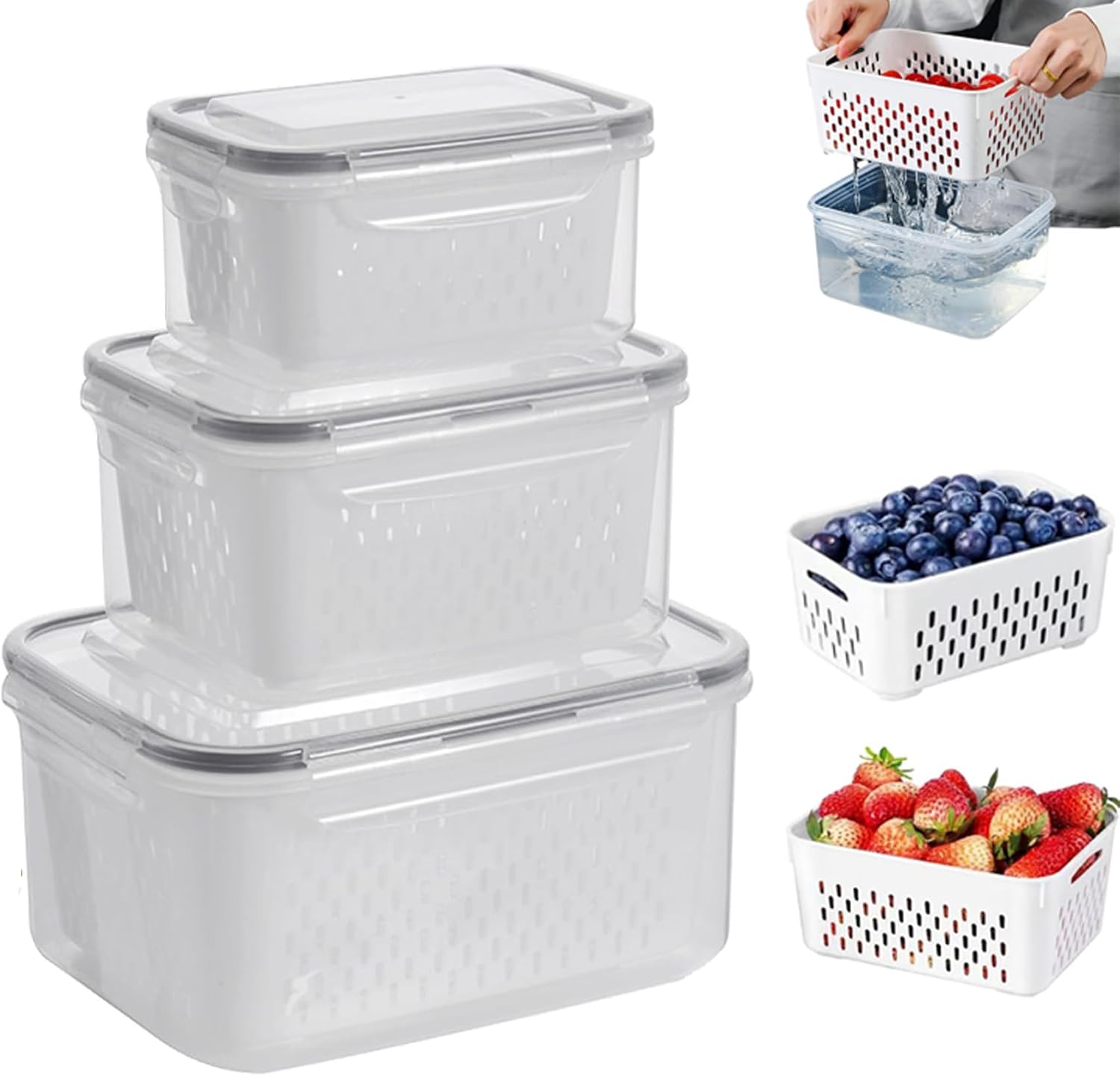 Household Transparent Plastic Food Storage Box-Including Drain Basket, Pack of 3 Drain Storage Basket, Transparent Kitchen Drain Storage Basket (L Black)