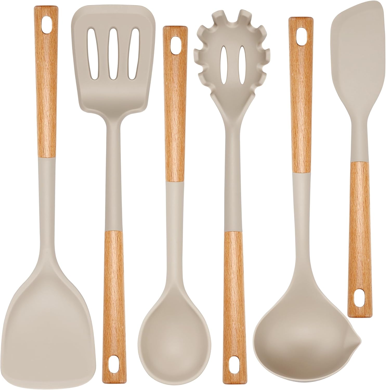 - SOFT, NON-SCRATCHING POTS AND PANS: This stylish set has plenty of variety and options to provide the basic utensils you need when cooking. The 6-piece set includes everything from soup ladle, Solid spoon, slotted turner,solid turner, pasta server and spatulas.These kitchen tools cater to a variety of cooking, baking and food processing needs for different kitchen tasks
